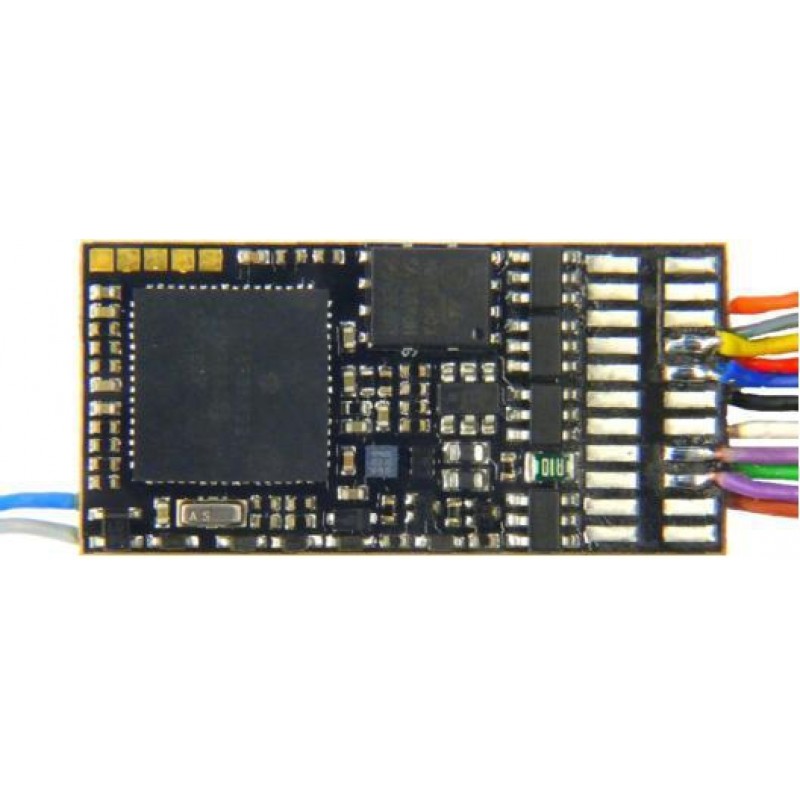 3 W Audio 10 Fu-Ausgänge (davon 4 mit Drähten, 6 auf Löt-Pads), 13 Anschlussdrähte Voll ausgestattet mit allen ZIMO Eigenschaften: DCC und MM, 2 Servo-Steuerleitungen, SUSI, RailCom, NMRA und ZIMO Function mapping, u.v.a.