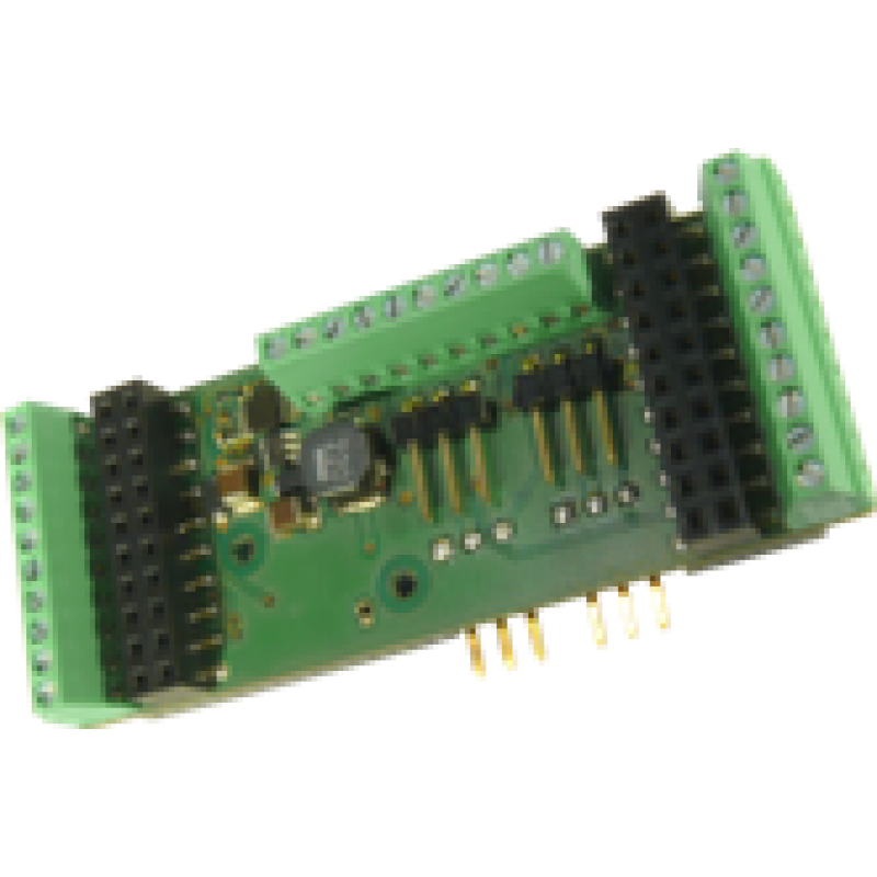 Lokplatine mit eigener Niederspannungsquelle, Decoder MX696S oder MX696V können aufgesteckt werden, mit 30 Schraubklemmen.zur Lok-Verdrahtung.