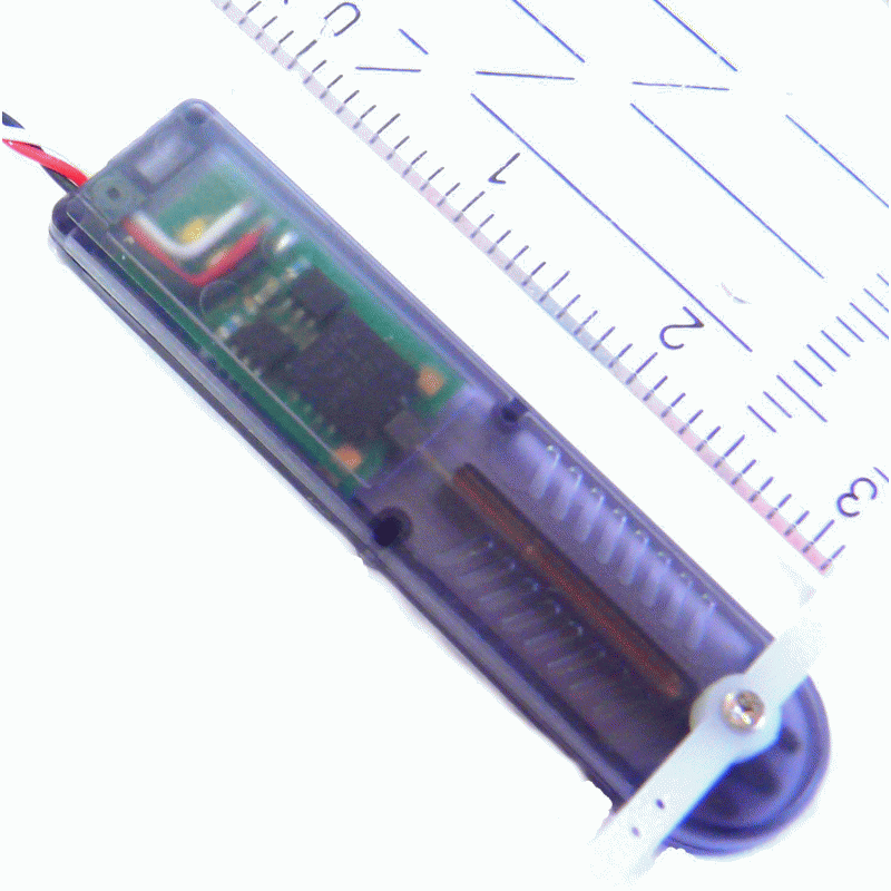 Subminiatur-Servo auf Memory-Draht Basis; die 3 Anschluss-Leitungen (Masse, Spannungsversorgung mit 5 V, Steuerleitung) entsprechen der üblichen Servo-Norm; der RC-1 kann daher mit allen ZIMO Decodern die Servo-Ausgänge besitzen (also mit fast allen)verwendet werden.